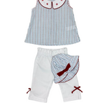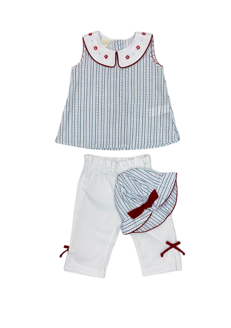 Conjunto de tres piezas de Bordino para bebé niña que incluye gorro coordinado. Presentado en tonos marino con detalles multicolor, está confeccionado íntegramente en algodón 100%, garantizando suavidad y resistencia. Opción completa y práctica para el vestuario de tu bebé, con diseño cuidado y materiales de primera calidad.