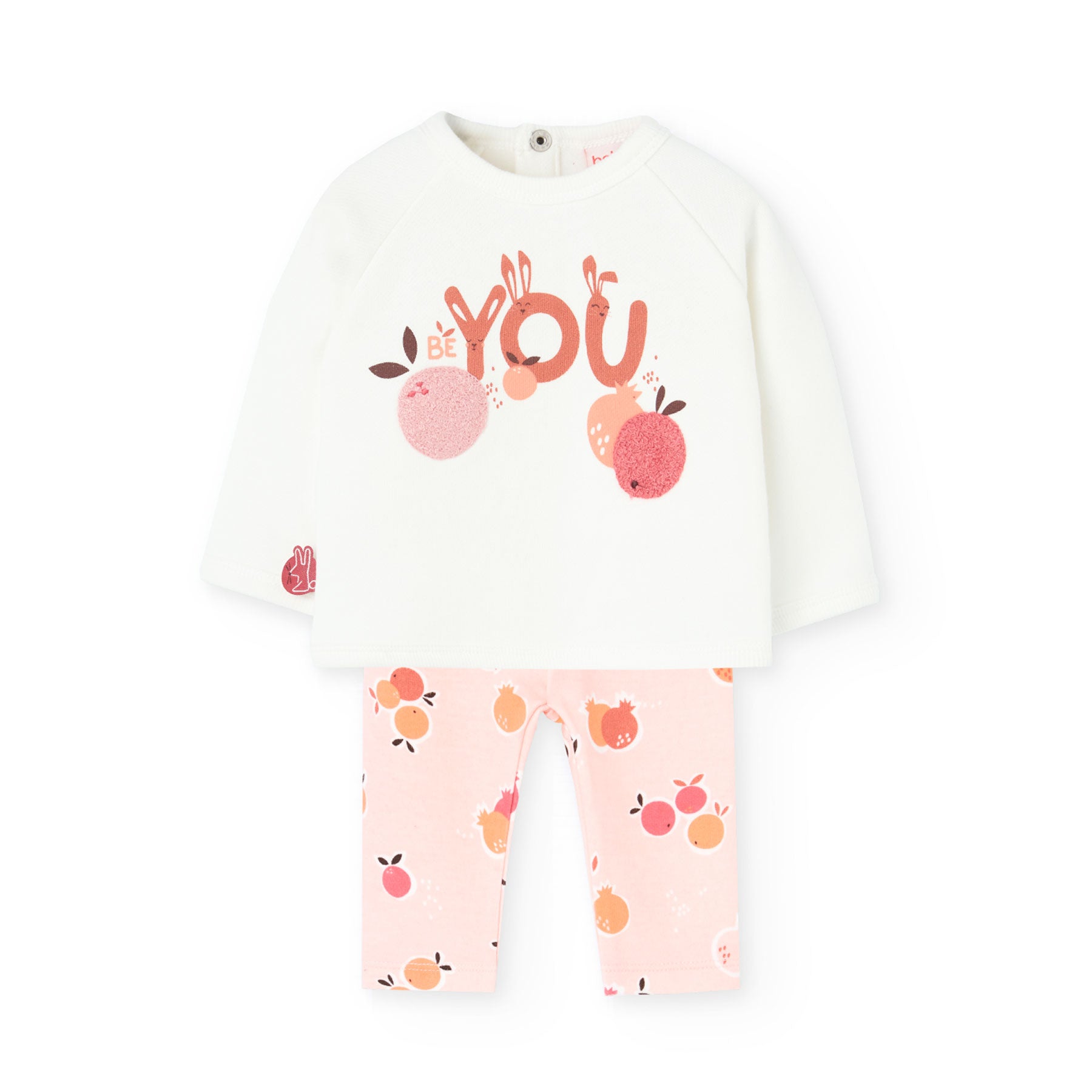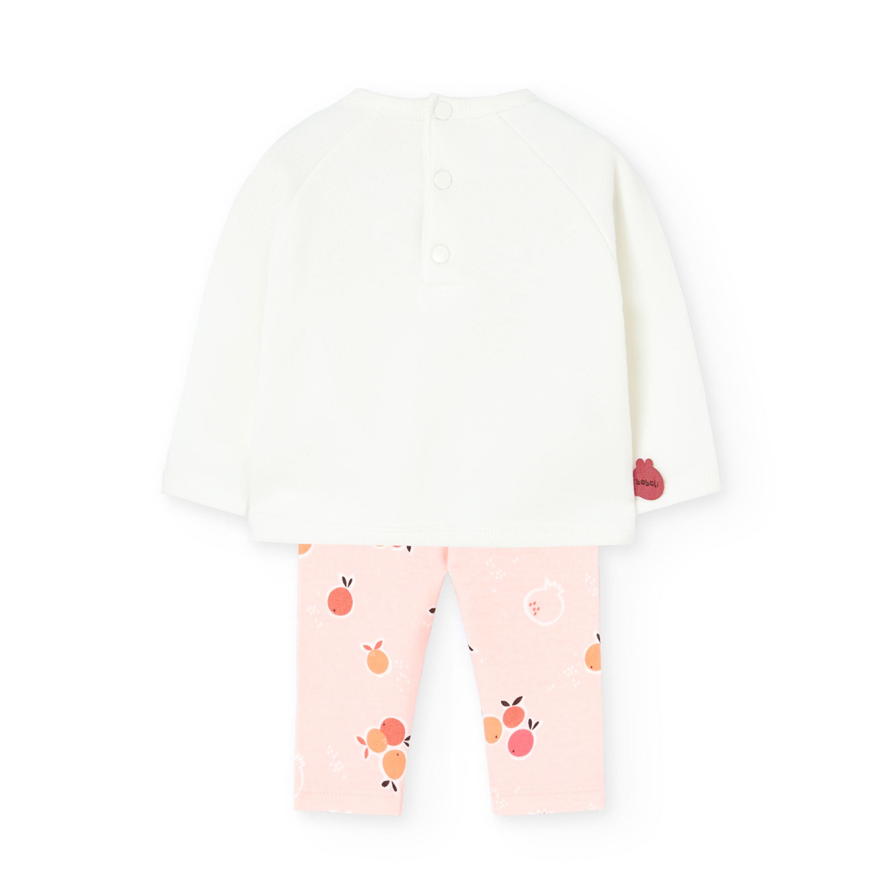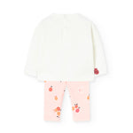 Conjunto para bebé niña de la marca Boboli en color blanco. La camiseta está confeccionada en 100% algodón jersey, mientras que el pantalón combina 95% algodón y 5% elastano para mayor comodidad y flexibilidad.