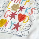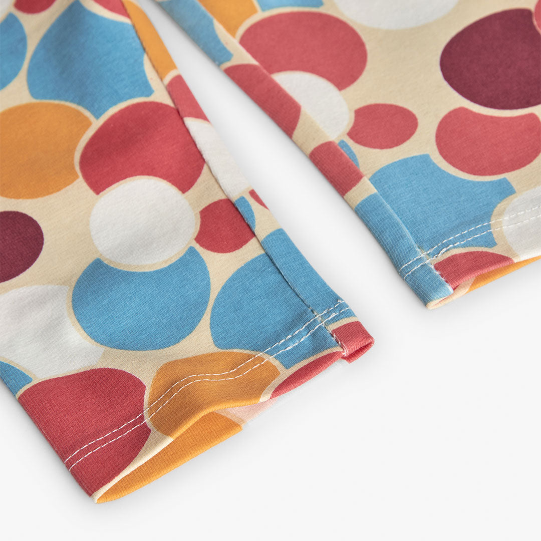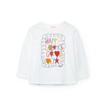 Conjunto para bebé niña de la marca Boboli, que incluye una camiseta blanca de manga larga con estampado y un pantalón multicolor. La camiseta está confeccionada 100% en algodón, mientras que el pantalón combina 92% algodón y 8% elastano para mayor comodidad y ajuste.