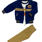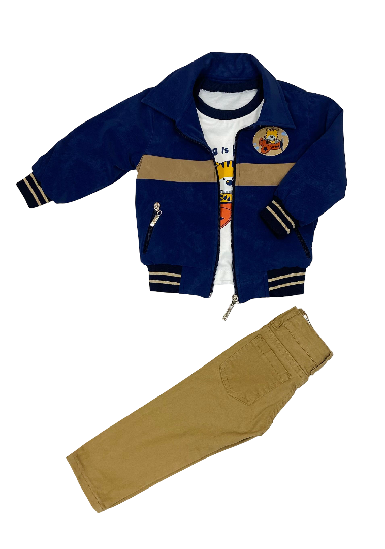 Conjunto de tres piezas de la marca People Kids para bebé niño, integrado por chaqueta azul, camiseta y pantalón camel. La chaqueta está confeccionada en 100% poliéster, ofreciendo resistencia y fácil mantenimiento. La camiseta de 100% algodón proporciona suavidad y transpirabilidad óptima para la delicada piel del bebé. El pantalón en 100% poliéster asegura durabilidad y comodidad durante el uso diario. Una propuesta versátil que combina calidad de materiales con practicidad.