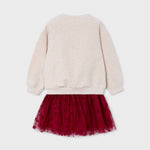 Conjunto falda para niña de la marca Mayoral en color vinotinto. El pullover está confeccionado con 57% algodón, 38% poliéster y 5% elastano, ofreciendo comodidad y flexibilidad. La falda cuenta con una composición de 88% poliéster, 9% poliamida y 3% elastano, complementada con un forro integrado de 84% poliéster y 16% algodón para mayor suavidad y ajuste.