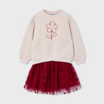 Conjunto falda para niña de la marca Mayoral en color vinotinto. El pullover está confeccionado con 57% algodón, 38% poliéster y 5% elastano, ofreciendo comodidad y flexibilidad. La falda cuenta con una composición de 88% poliéster, 9% poliamida y 3% elastano, complementada con un forro integrado de 84% poliéster y 16% algodón para mayor suavidad y ajuste.
