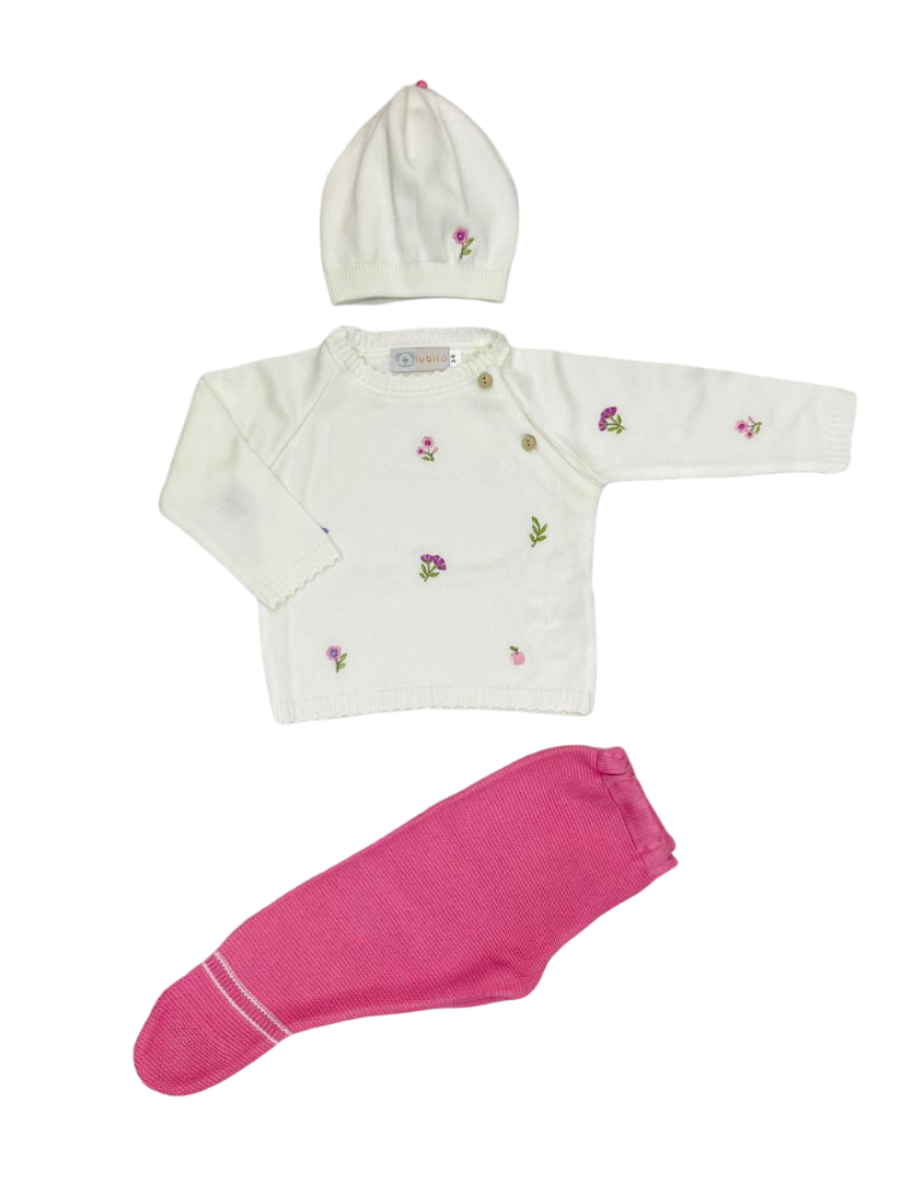 Conjunto de tres piezas para bebé niña en fucsia, diseñado por Bebita con una mezcla textil de 50% acrílico y 50% modal. Esta composición ofrece elasticidad y confort excepcionales, permitiendo libertad de movimiento mientras mantiene la forma de las prendas. El material híbrido asegura resistencia al uso frecuente y facilita el mantenimiento, siendo ideal para la piel sensible del bebé.