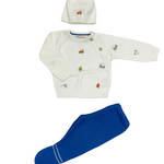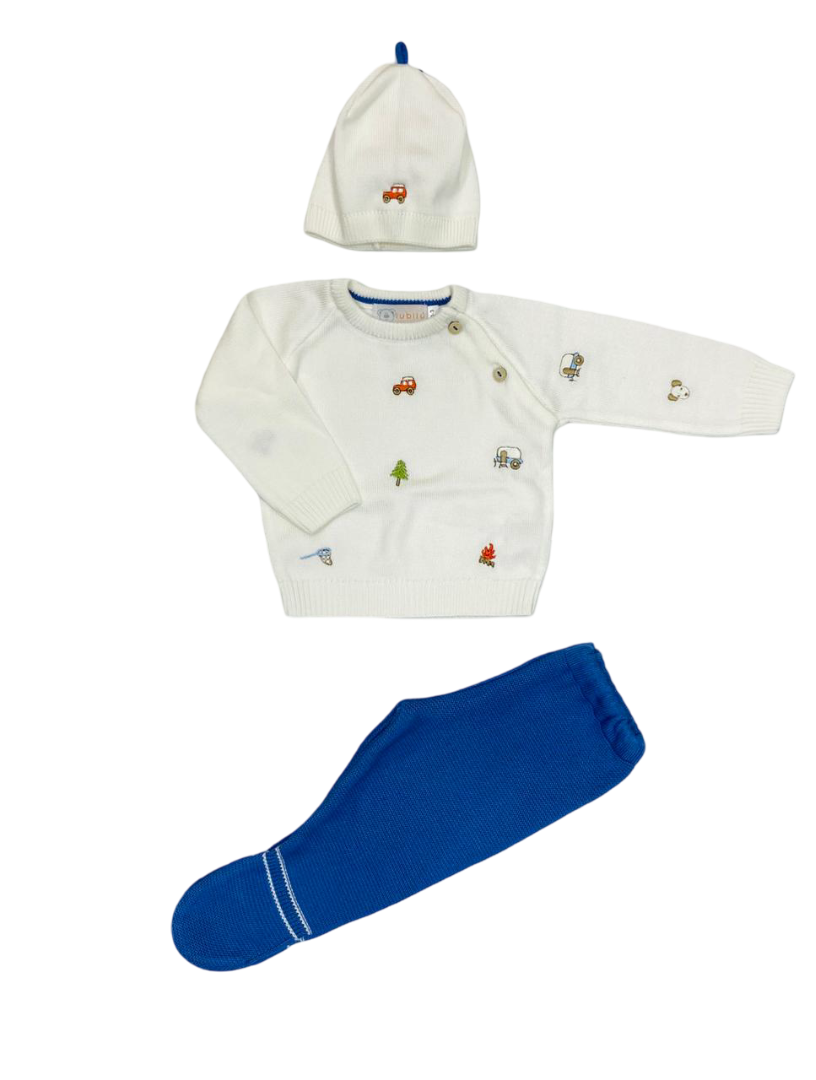 Conjunto de la marca Bebita en tonalidad azul, elaborado con una composición textil de 50% acrílico y 50% modal. Esta combinación de fibras proporciona suavidad excepcional y durabilidad superior, garantizando prendas que resisten el uso intensivo y los lavados frecuentes. El material híbrido mantiene su forma y color a lo largo del tiempo.
