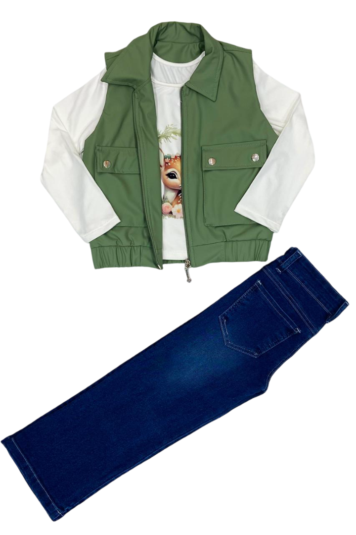 Conjunto de tres piezas de People Kids en verde, elaborado con composiciones textiles seleccionadas para óptimo desempeño. El chaleco utiliza una mezcla de 97% poliéster y 3% elastano que resiste el uso frecuente manteniendo su forma. El buzo de algodón puro al 100% ofrece suavidad y regulación térmica natural. El pantalón combina 97% algodón con 3% spandex, permitiendo movimiento sin restricciones. Ideal para niñas que requieren prendas duraderas y cómodas.