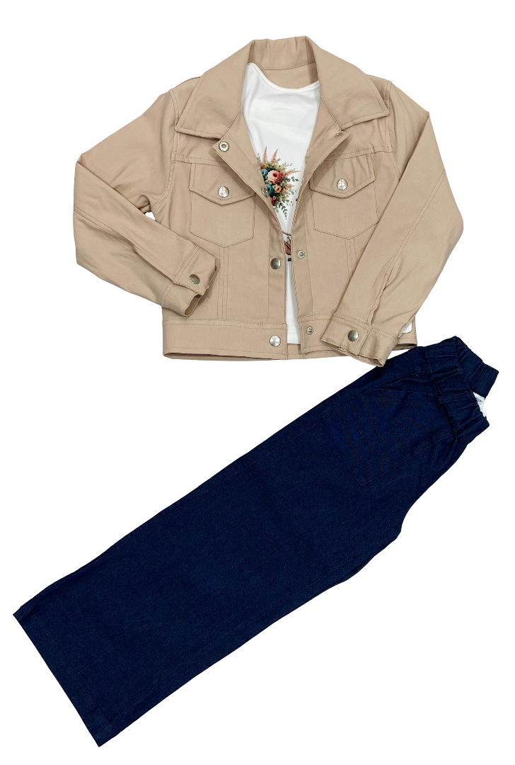 Conjunto de tres piezas para niña de la marca People Kids en tonalidad beige en la chaqueta y Negro en el Pantalón. Incluye chaqueta confeccionada en 100% poliéster de alta durabilidad, camiseta en 100% algodón puro que proporciona comodidad y transpirabilidad, y pantalón en mezcla de algodón con elastano para mayor flexibilidad en el movimiento. Una opción versátil y práctica para el guardarropa infantil.