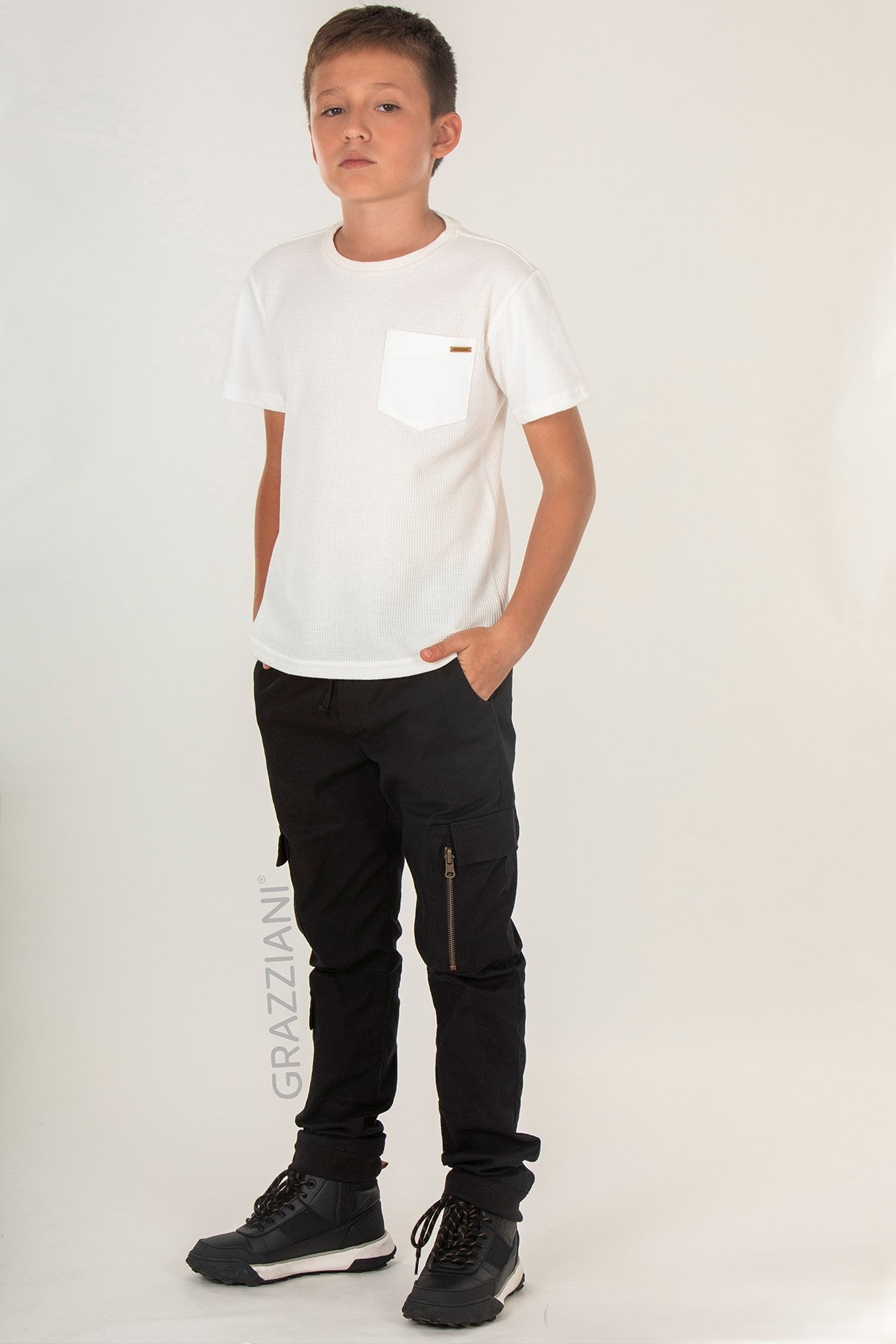 Pantalón tipo cargo para niño de la reconocida marca Grazziani en elegante color negro. Fabricado con una composición de 95% algodón y 5% elastano, ofrece la combinación perfecta entre resistencia y flexibilidad. Ideal para el uso diario, proporciona comodidad y permite que tu hijo se mueva sin restricciones mientras mantiene su forma original.