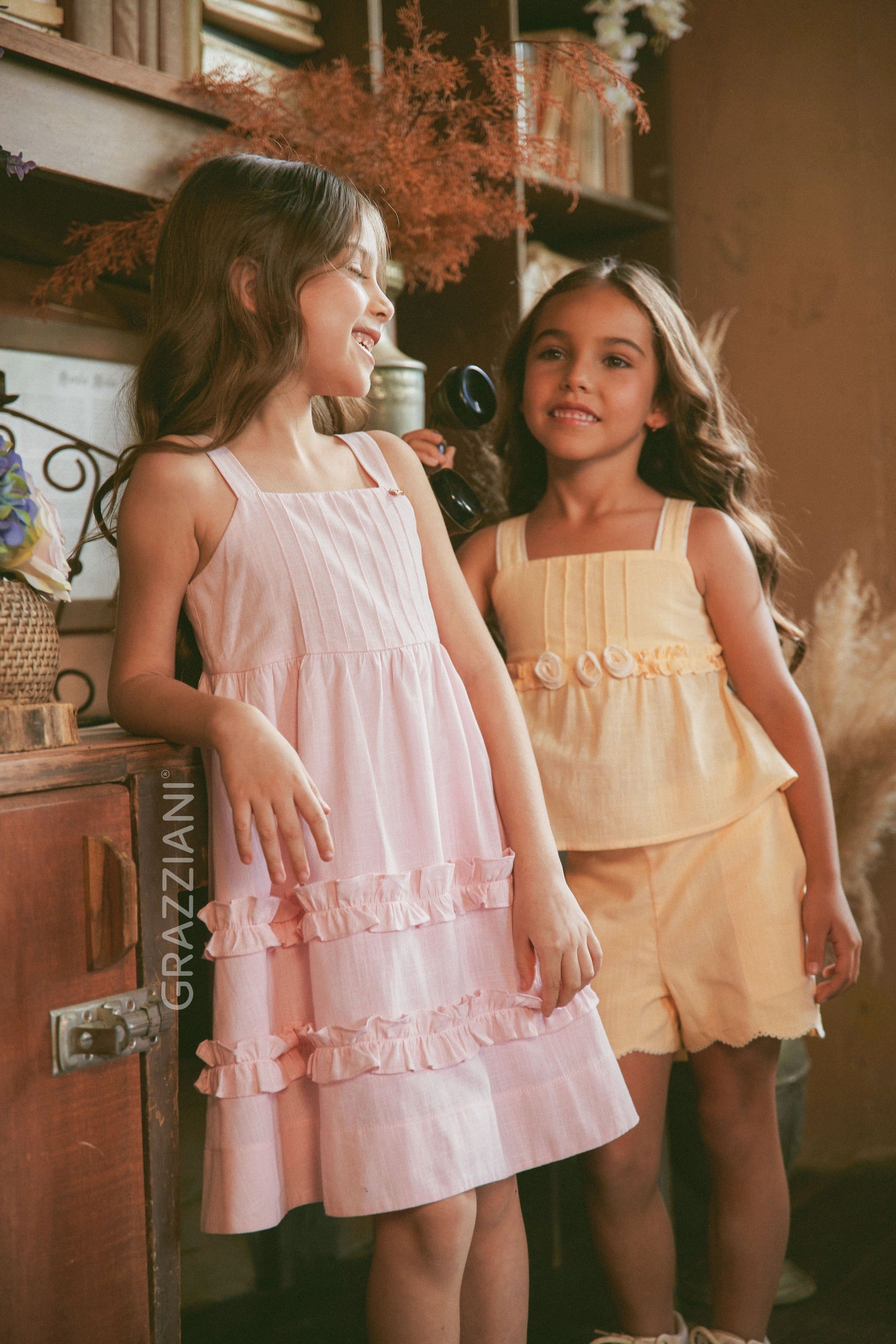 Hermoso vestido infantil Grazziani en tonalidad rosada, confeccionado completamente en algodón de alta calidad. Perfecto para que tu niña luzca cómoda y elegante en cualquier ocasión, con la suavidad y transpirabilidad que caracteriza a las prendas de algodón puro.